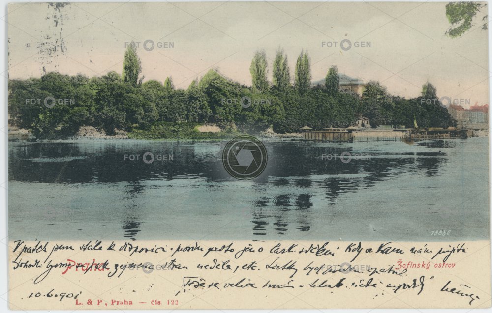 1901 barevná color colored island kolorovaná místopis ostrov plovárna Prague Praha river řeka Slovanský swimming bath topography Vltava Žofín Žofínský