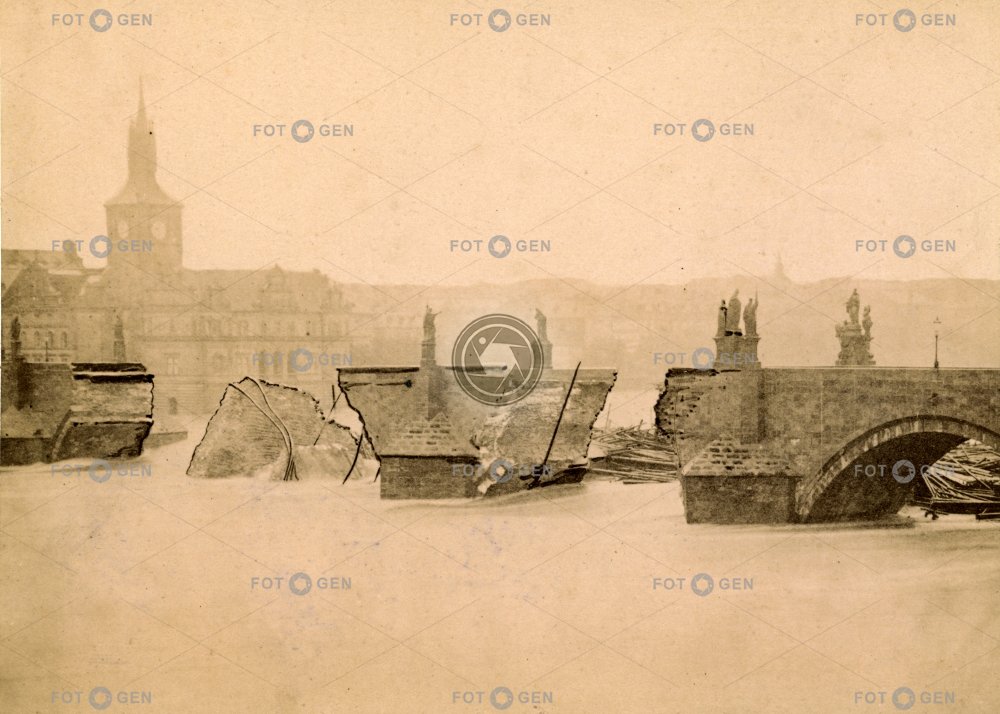 Zřícený Karlův most za povodně, pohled z Malé Strany proti proudu, 4. 9. 1890, kabinetka